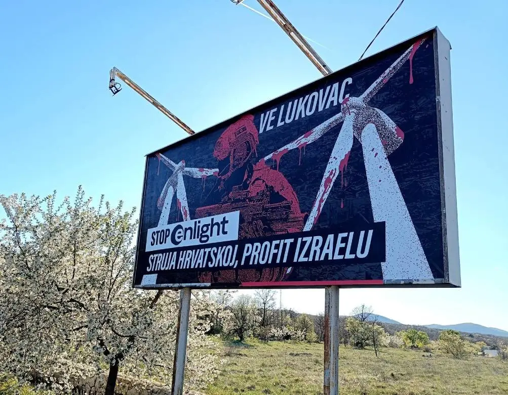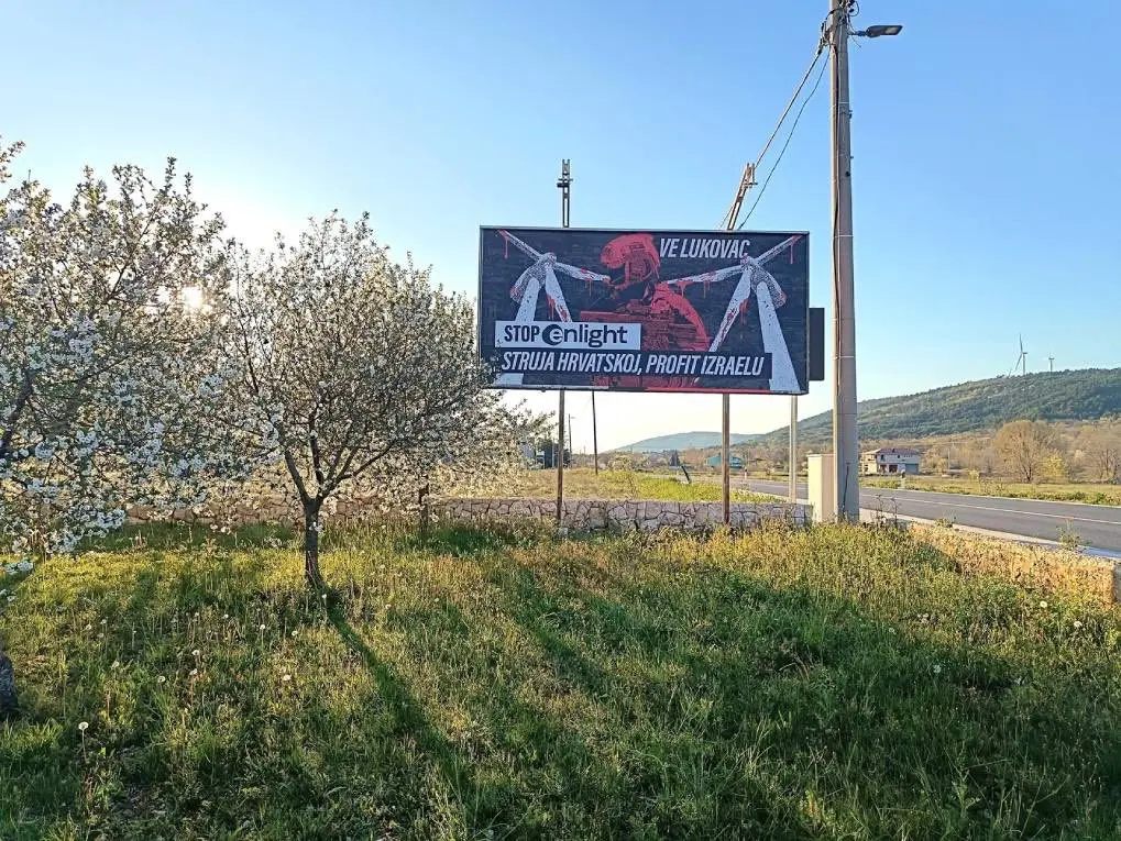 Plakat je postavila inicijativa Nepokorena Palestina. Radi se o natpisima “Struja Hrvatskoj, profit Izraelu, a teror Palestini” i “Stop Enlight Renewable Energy”, referirajući se na projekte ove izraelske firme u Hrvatskoj